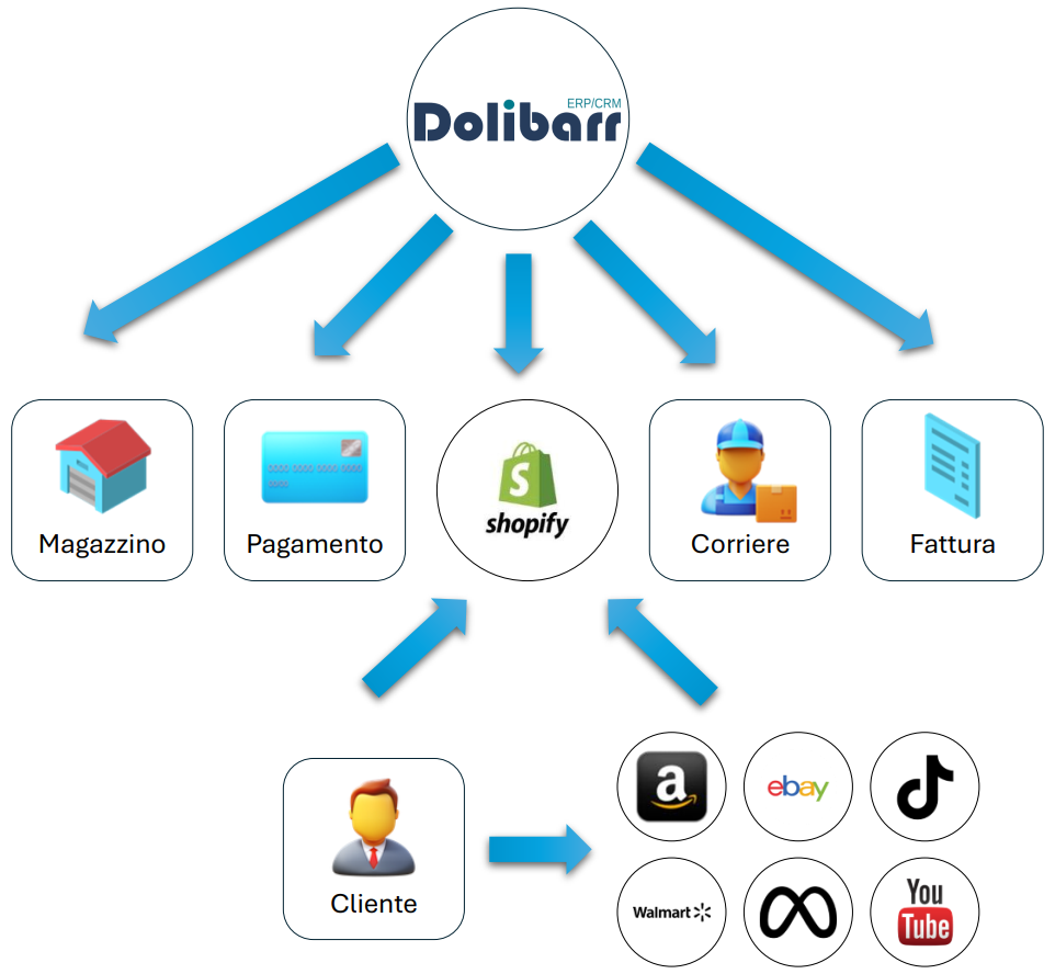 Grazie a Shopify, il negozio può essere collegato alle principali piattaforme di vendita e canali digitali, come Google Shopping, Facebook e Instagram Shop, TikTok Shop e altri marketplace compatibili, permettendo di gestire le vendite da un’unica base operativa.
